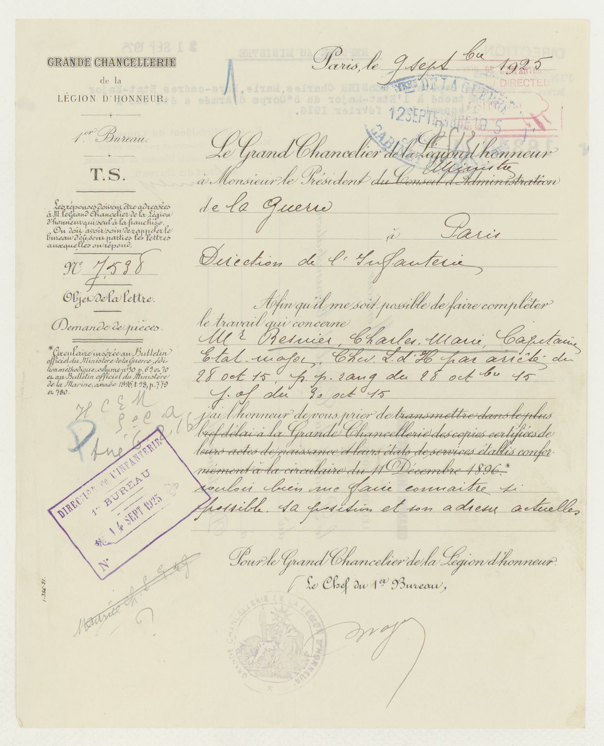 Demande de renseignements de la Grande Chancellerie concernant le Capitaine BESNIER en 1925