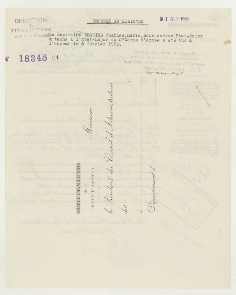 Demande de renseignements de la Grande Chancellerie concernant le Capitaine BESNIER en 1925