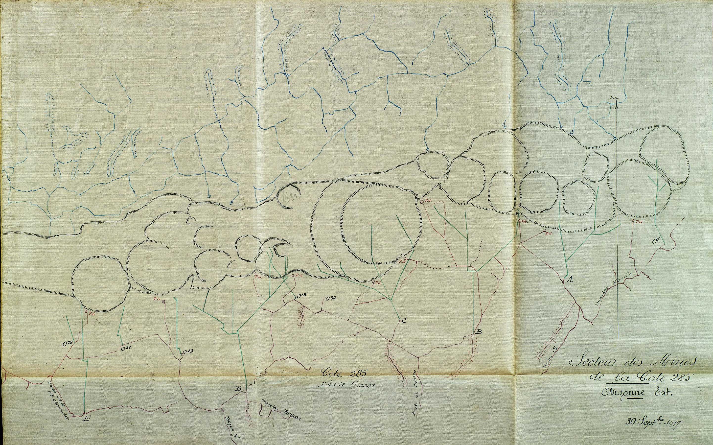 Carte des mines de la Cote 285 dont la Compagnie 15/11 avait la charge. Carte datée du 30 septembre 1917, soit quelques jours avant la relève de la Compagnie