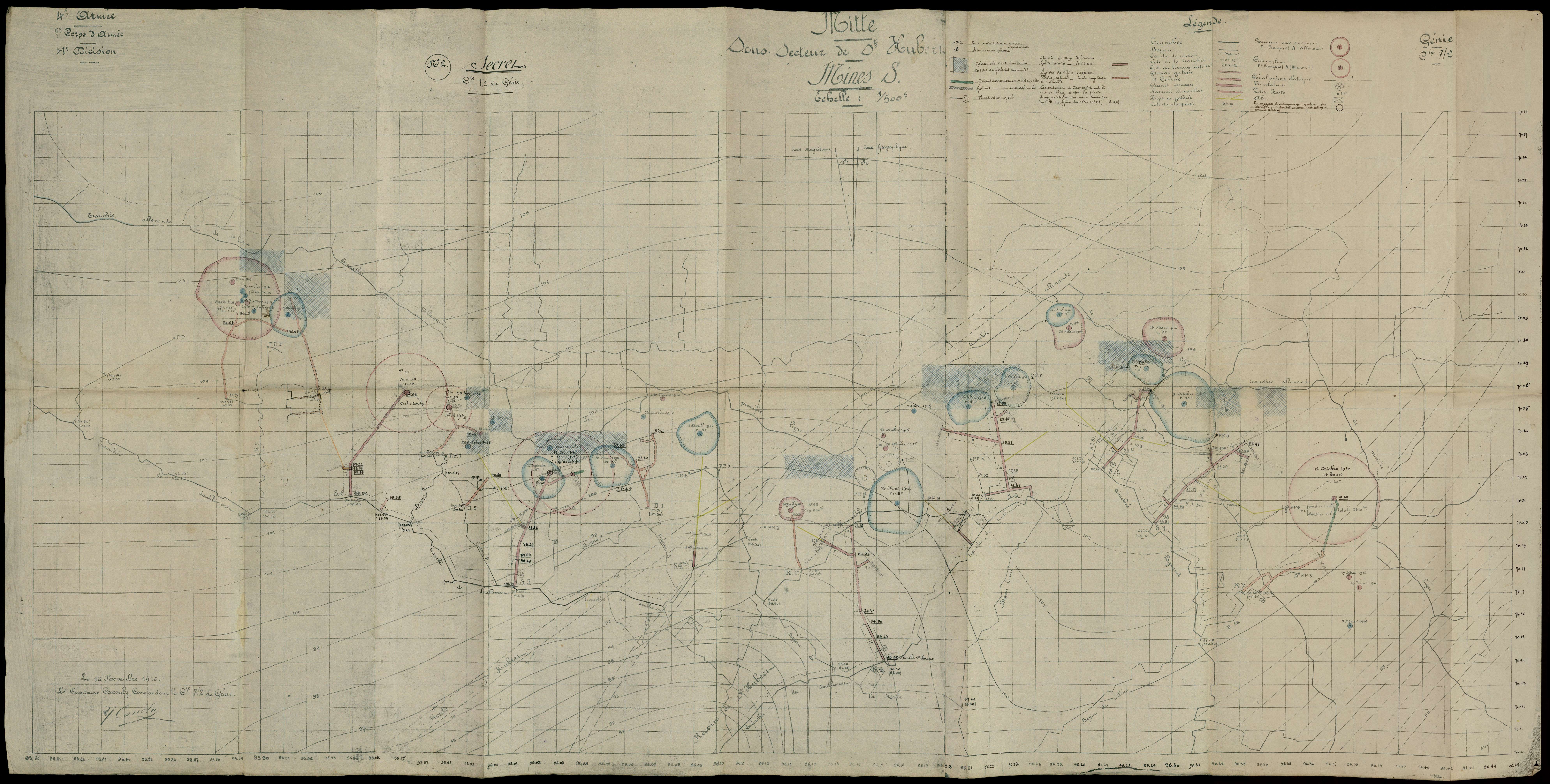 Carte au 1/500ème du réseau de mines S datée du 16 novembre 1916 - Secteur la Mitte, sous-secteur de Saint-Hubert.