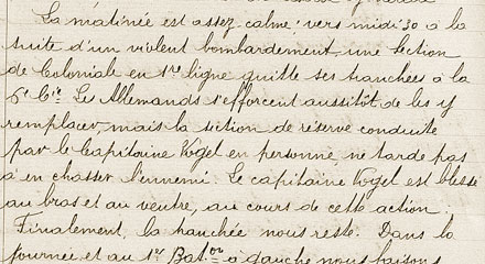Récit du séjour du Capitaine VOGEL Commandant la 6ème Compagnie du 120ème R.I. Relève du 147ème R.I. dans le bois de la Gruerie, puis période de repos à Florent, avant de remonter en 1ères lignes au saillant de Bagatelle où le Capitaine VOGEL sera blessé puis évacué.