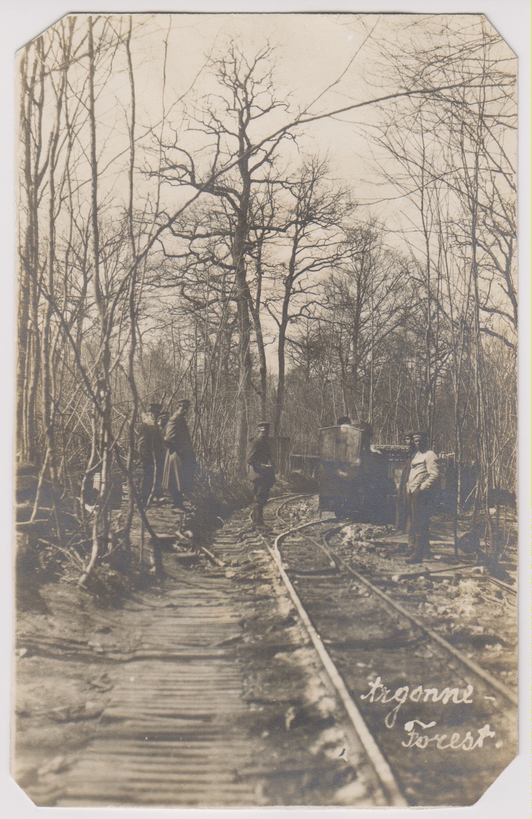 Soldats allemands le long d’une voie de l’Argonnenbahn dans la forêt