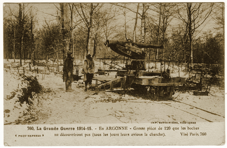 En Argonne, grosse pièce de 120 sur rails pendant l’hiver 1914/1915