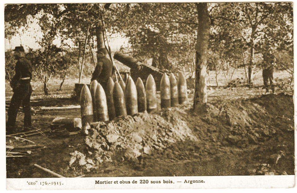 Mortier et obus de 220 sous les bois en Argonne en 1915