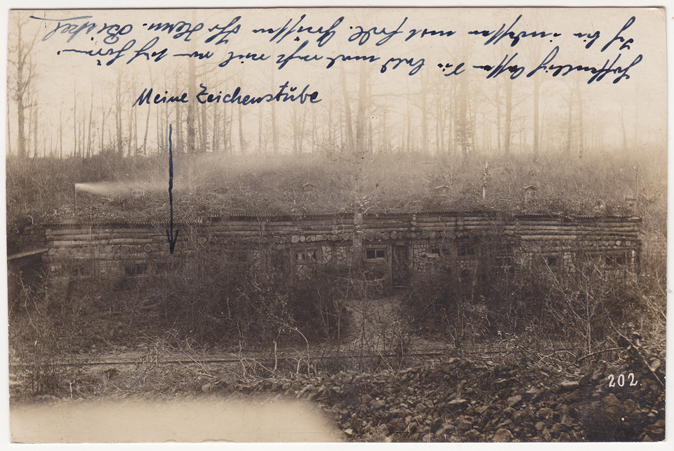 Baraques allemandes devant une voie de l’Argonnenbahn