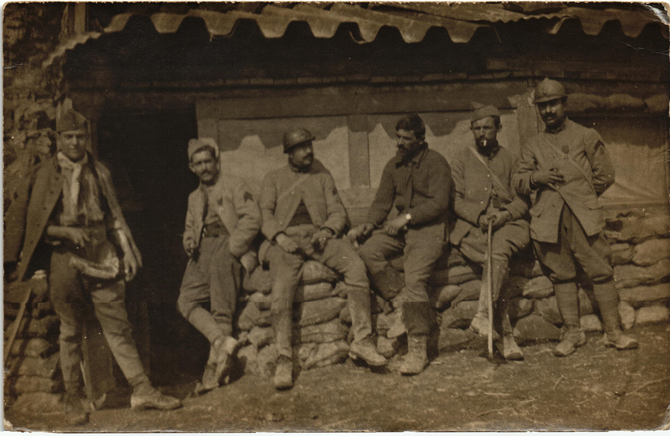 Soldats français au PC du Capitaine dans le ravin des Courtes Chausses en mars 1917