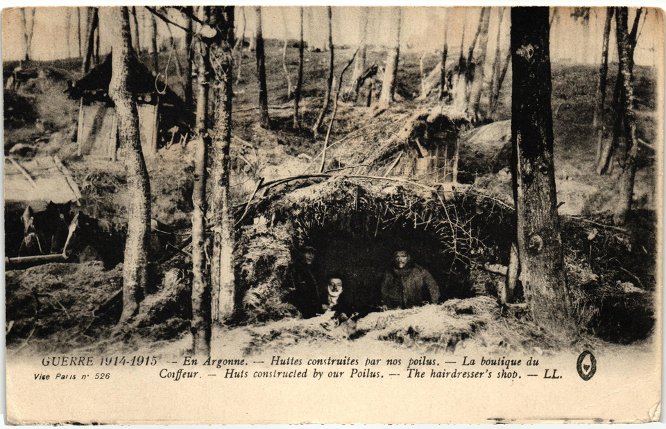 En Argonne, huttes construites par nos poilus. La boutique du coiffeur