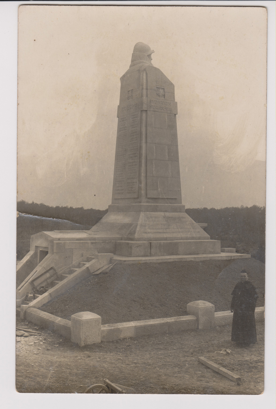 Un abbé au pied du monument de la Haute Chevauchée tout juste érigé