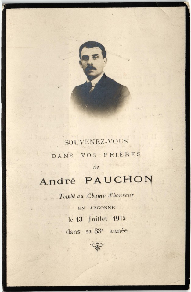 Souvenir de André Pauchon, soldat de 2ème classe au sein du 82ème Régiment d’Infanterie, Mort pour la France à la Pierre Croisée, cote 285, le 13 juillet 1915