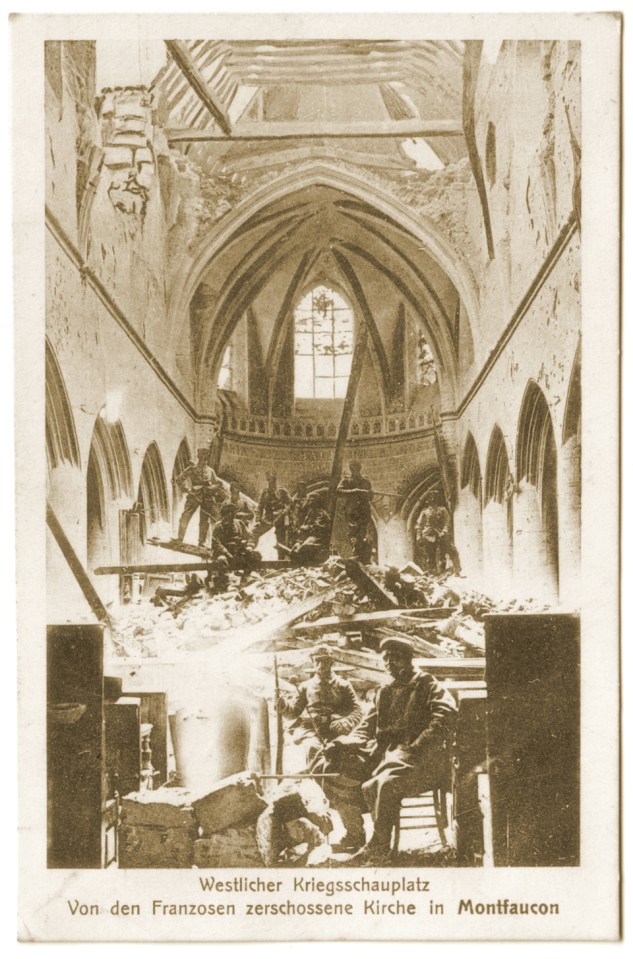 Montfaucon – soldats allemands à l’intérieure de l’église bombardée par les Français