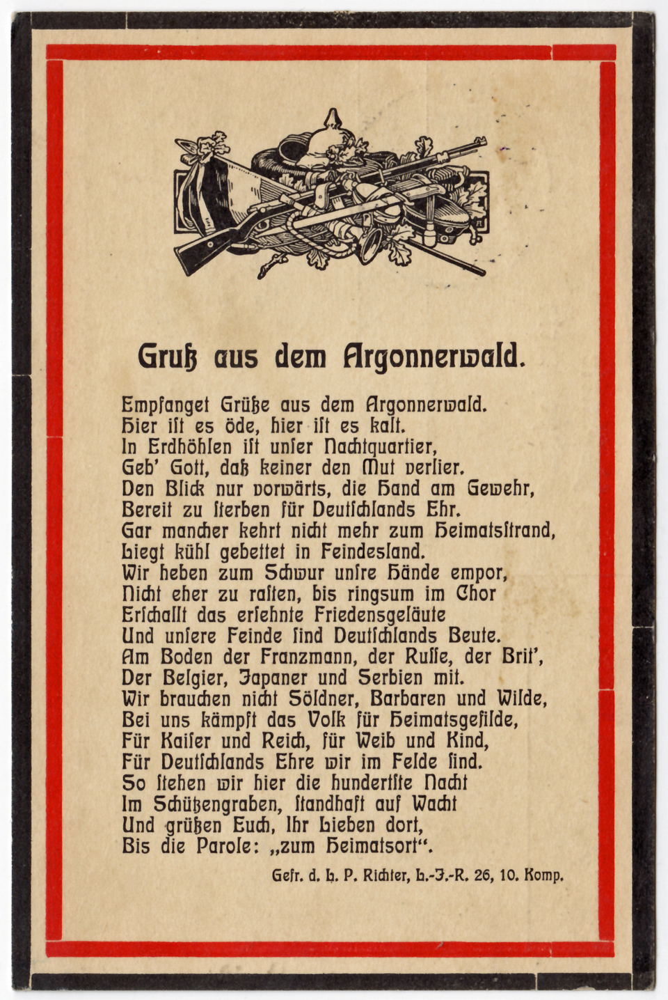 Grüss aus dem Argonnerwald, poême écrit par un soldat du L.I.R 26 – 10. Komp.