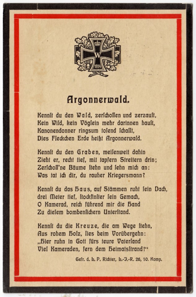 Argonnerwald, poême écrit par un soldat du L.I.R 26 – 10. Komp.