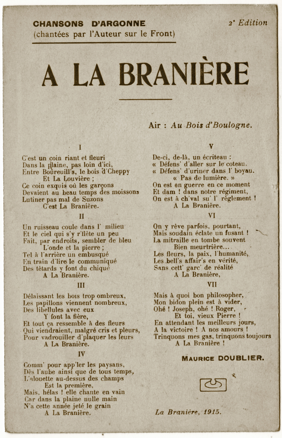 Note : Mobilisé en août 1914, le chansonnier Maurice Doublier enverra plusieurs chansons, dont celle-ci, décrivant la vie dans les tranchées (Aux Meurissons, A la Branière, Le Joueur de flûte) qui seront publiées dans le journal Le Bonnet Rouge. Maurice Doublier a été tué sur le front en Argonne en avril 1916.