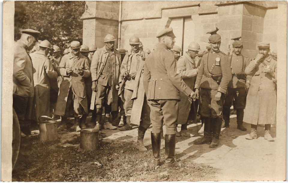 Prisonniers français au pied de l’église de Senuc en septembre 1915