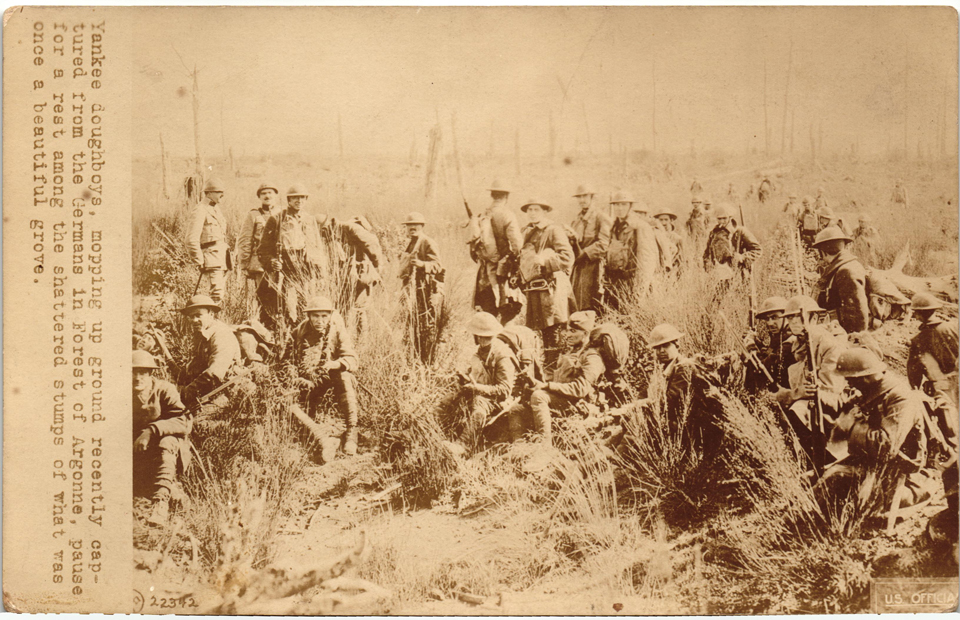 Soldats américains et français faisant une halte sur le terrain conquis en Argonne