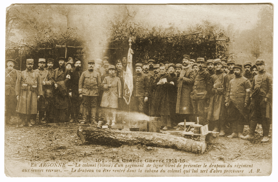 Le colonel (blessé) d’un régiment de ligne vient de présenter le drapeau du régiment aux jeunes recrues. Le drapeau va être rentré dans la cabane du Colonel qui lui sert d’abri provisoire.