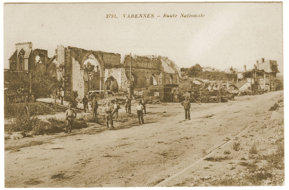 Varennes-en-Argonne, troupes allemandes devant les ruines de l’église